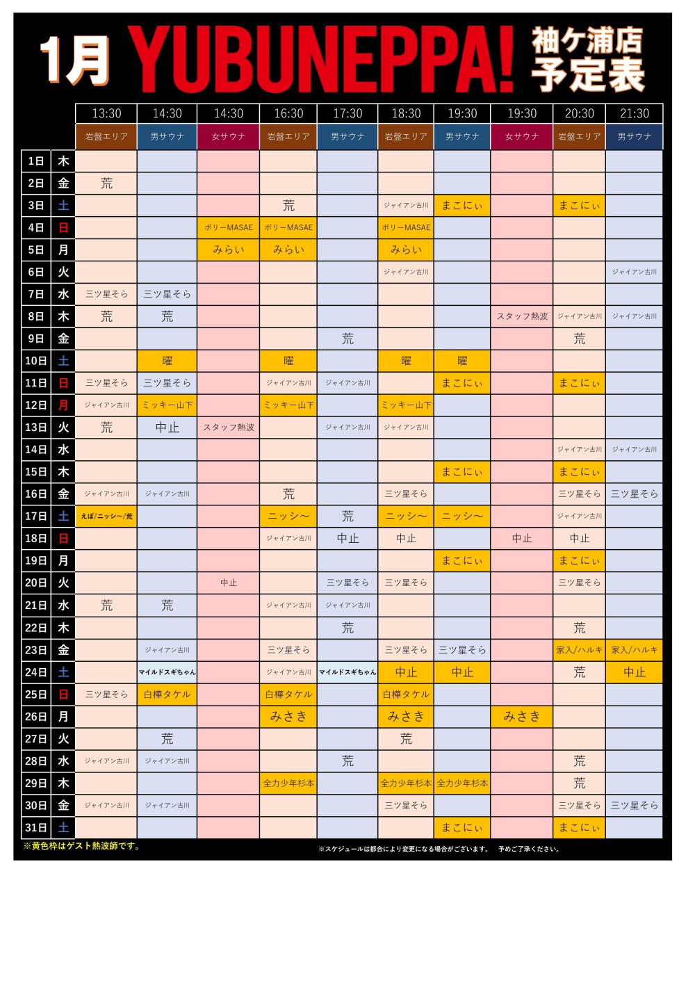 1月ゲスト熱波のお知らせ 2025年12月27日 お待たせいたしました!1月のゲストPOPとYUBUNEPPA予定表になります。変更ありましたら随時更新いたします。1/24に予定しておりましたデトロイト阿久津さんの熱波イベントですが諸事情により中止とさせていただきます。※1/22に更新しております。