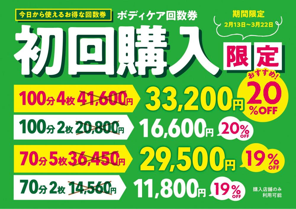 2月3月初回限定回数券販売について 2026年02月13日 2月13日〜3月22日の期間だけのお得な回数券です。 通常の回数券より最大20%お得となっております。 お身体を労わるきっかけにいかがでしょうか? この機会にぜひご利用ください♪ ※回数券を初めて購入される方限定の券となります。ご了承ください。